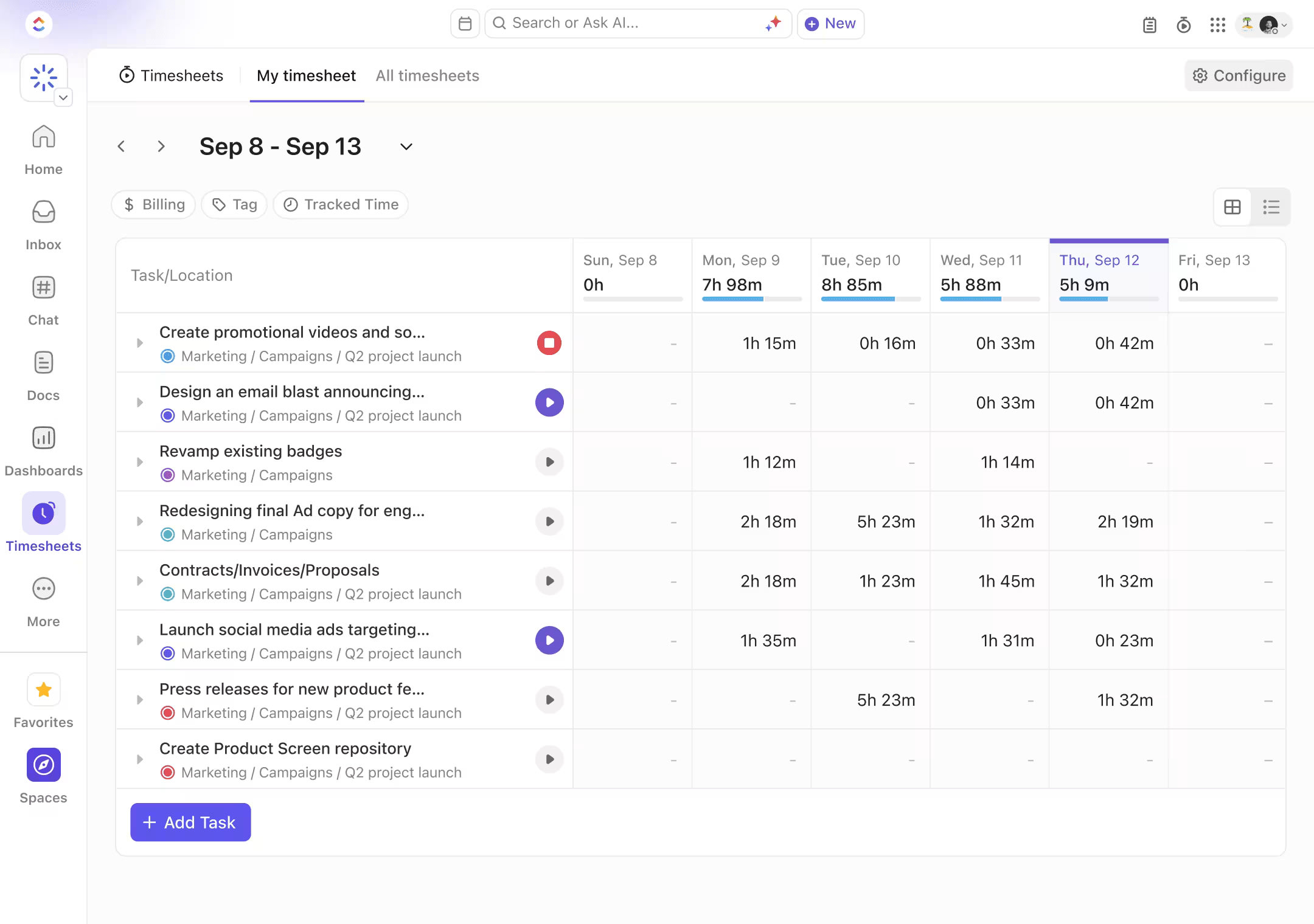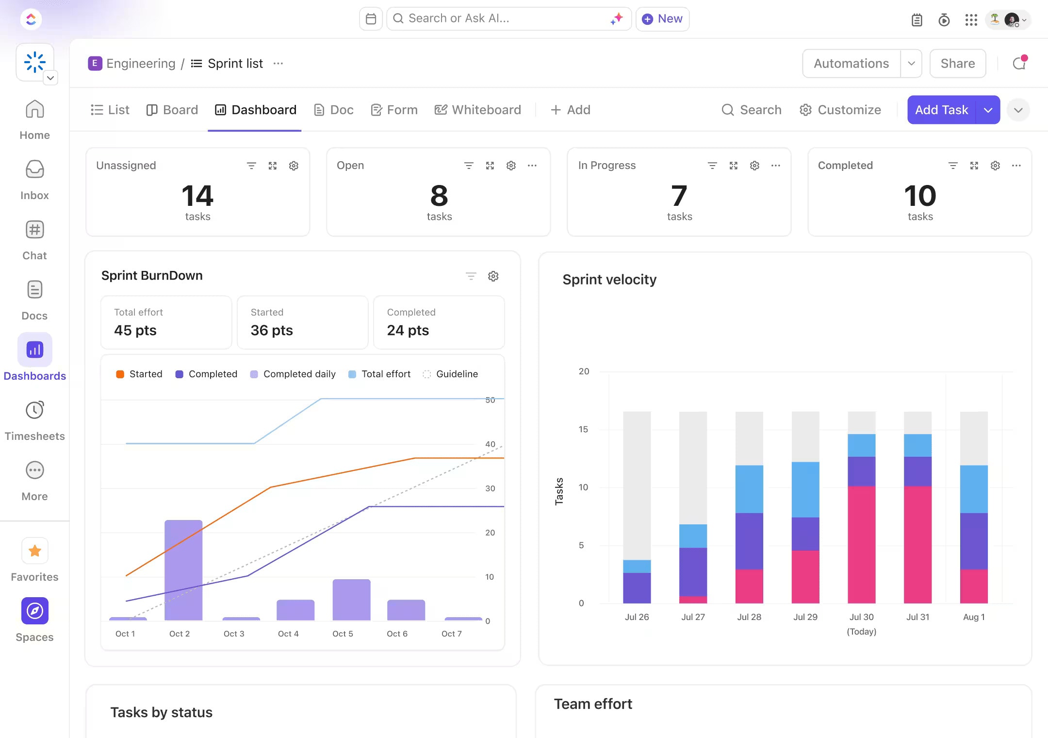 Monitor Performance: Build out your own Dashboard to track everything from content production to your team’s workload. ClickUp has over 50+ widgets to help analyze your productivity.